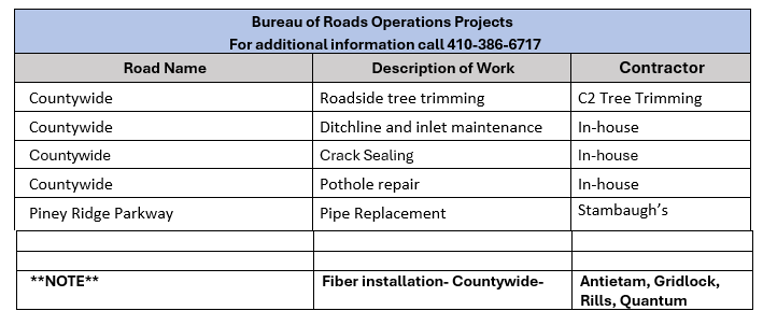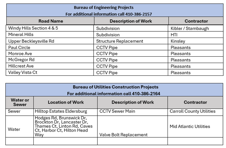 Carroll County Department of Public Works Road and Utilities Construction Project Schedule for the Week of January 19, 2026